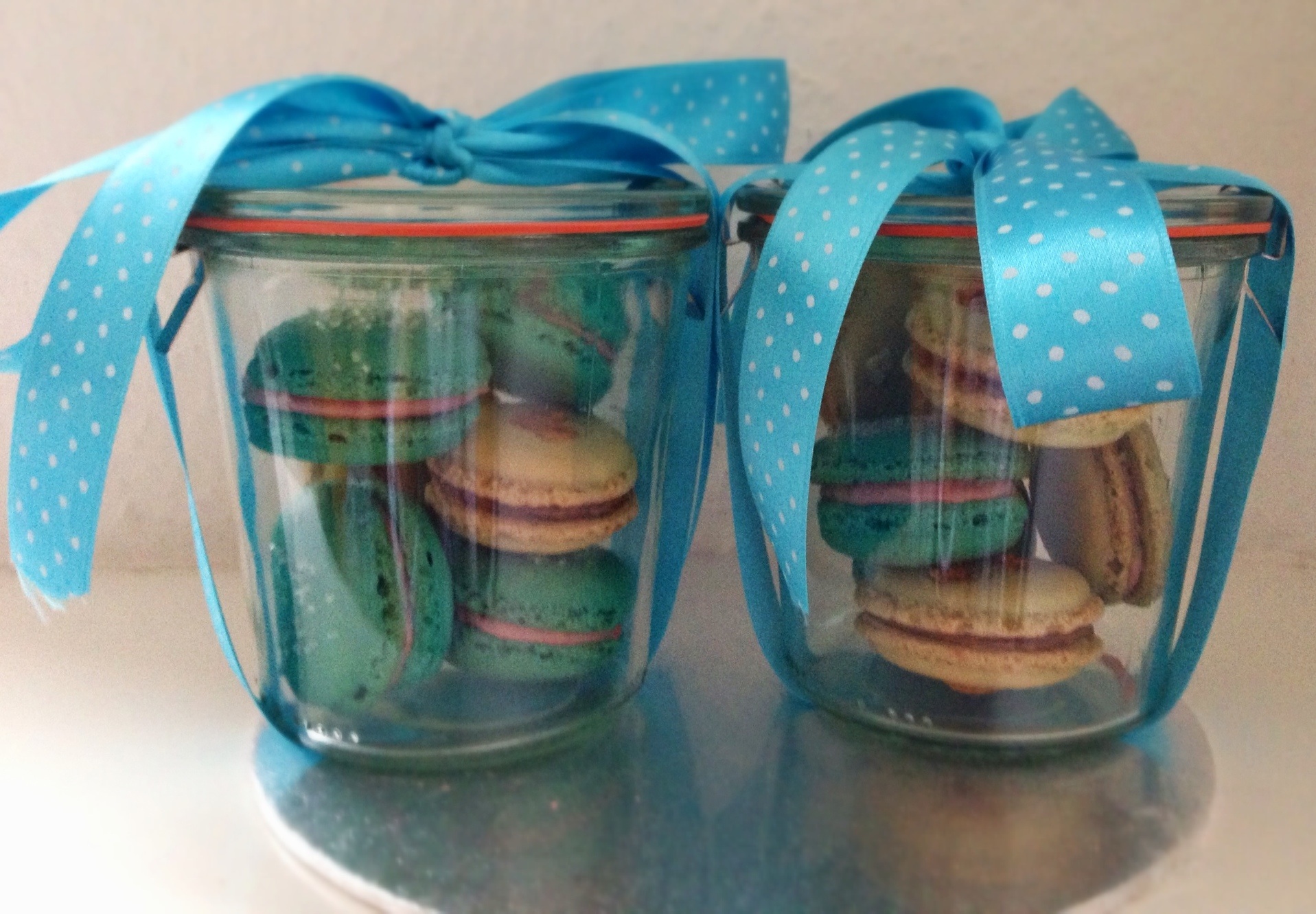 Macarons are always a nice present. They taste delicious and look pretty. Instead of a box I used a preserving jar and tied a nice ribbon around it.